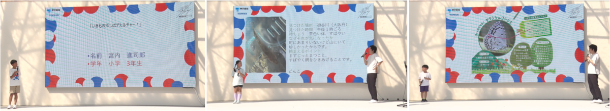 In the Field Presentation: “Discovering Creatures is Deculture!”, children presented the local creatures they had found themselves. Shogoro Fujiki, CEO of Biome Inc., and Shoji Kawamori, producer of the pavilion, joined the session and were deeply impressed by the children’s observational skills and presentations. The segment provided a meaningful opportunity to reflect on the importance of learning through hands-on experiences.