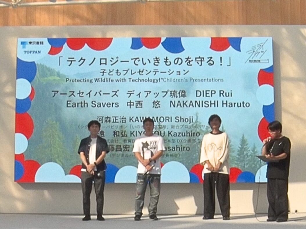 In the “Protecting Creatures with Technology!” segment, children presented innovative ideas such as drones for ecosystem research and AI apps to protect marine life worldwide. Shoji Kawamori, Masahiro Sato, Acting President of Digital Hollywood University, and Kazuhiro Kiyoto from Tokyo Shoseki Co., Ltd., joined the session, providing feedback from their respective areas of expertise on the children’s creative ideas. The audience responded with enthusiastic applause, highlighting the power of children’s free thinking to shape the future.