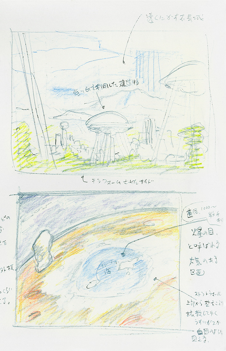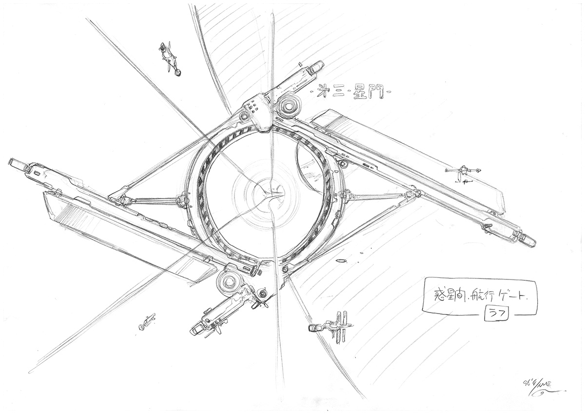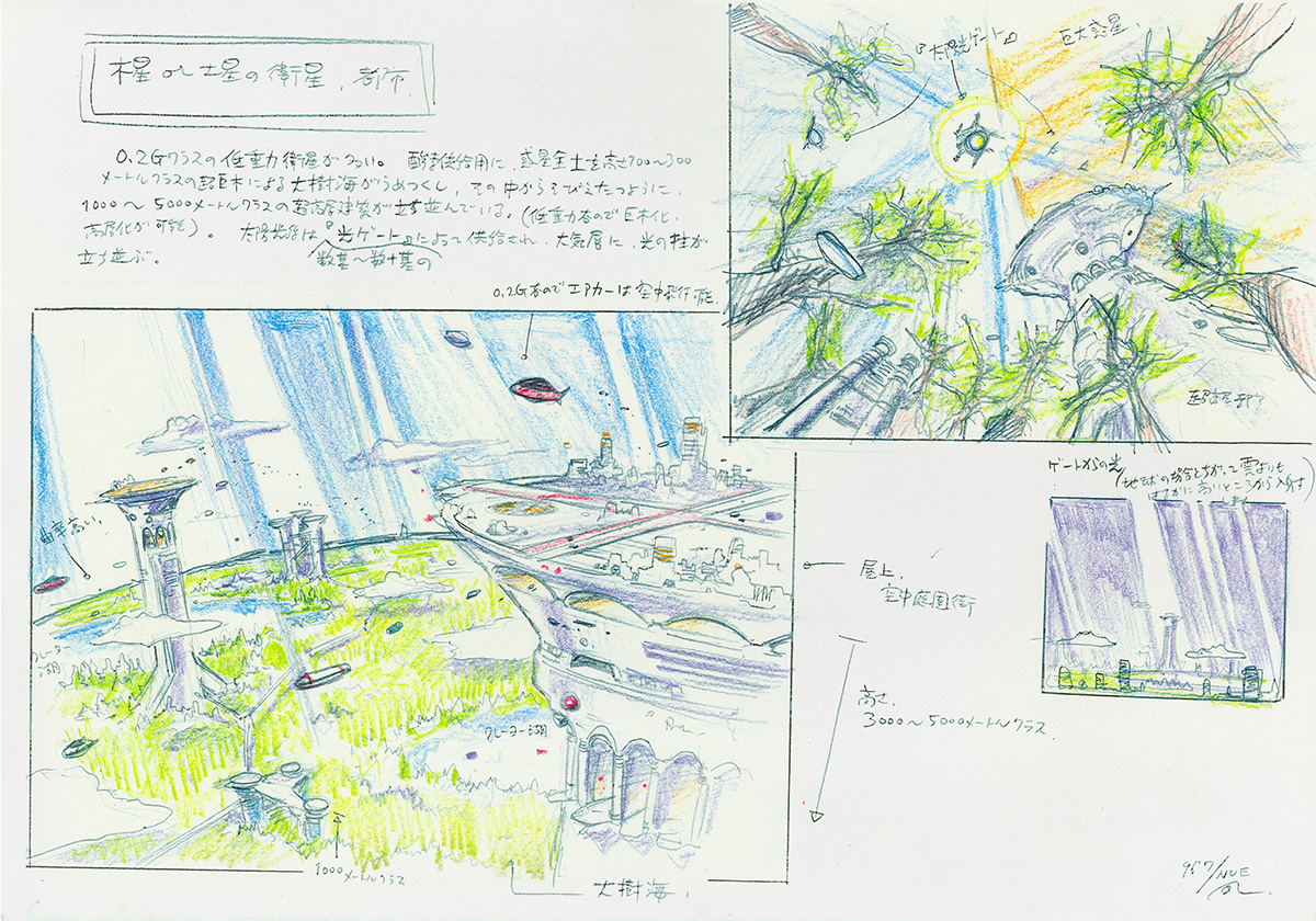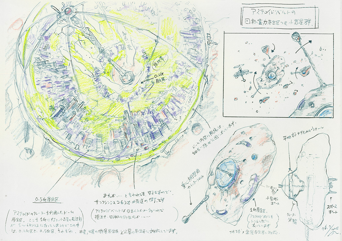 コンセプト案アステロイドベルトの回転重力居住区つき小惑星群アステロイドのクレーターを利用したドーム型居住区。河森が個人的に好きなサンフランシスコ的な坂道の多い街という想定。居住区はクレーター内の位置によって、0.2G区、0.5G区、1G区が細かく設定されている。