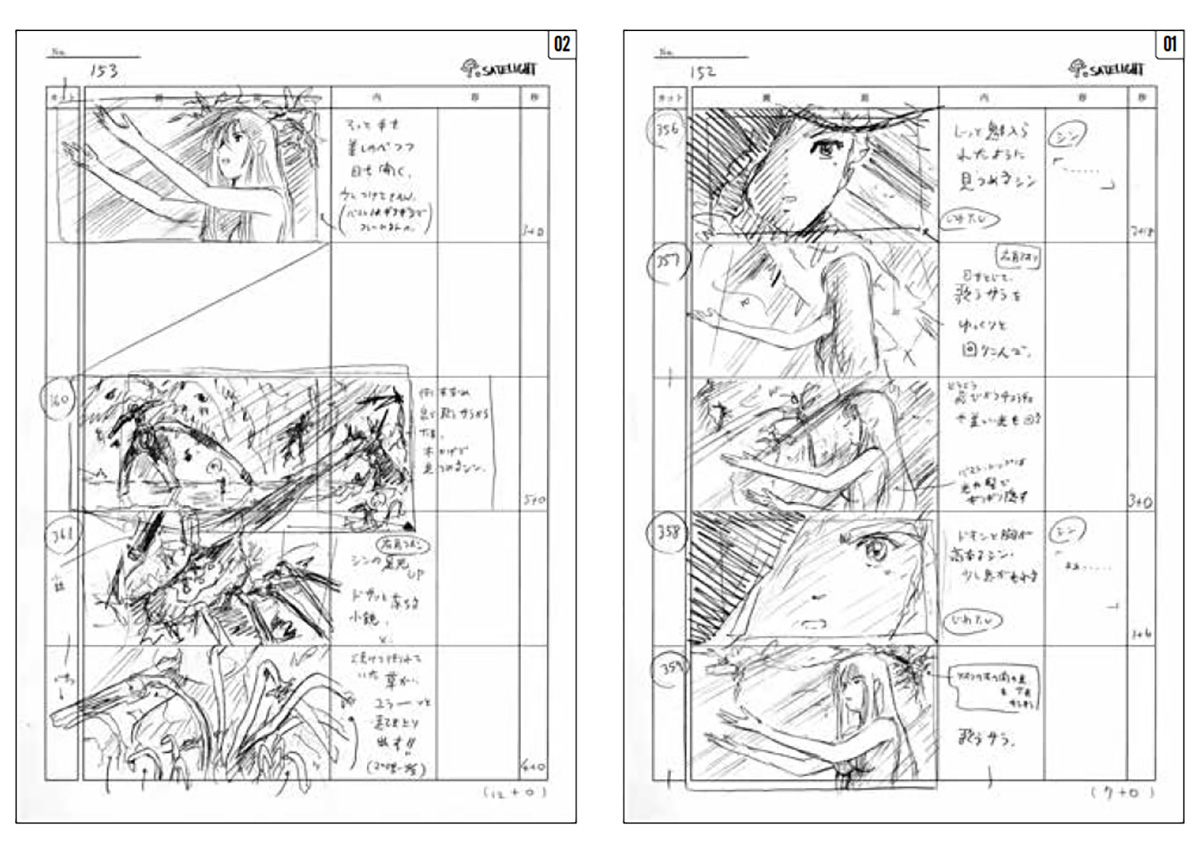 絵コンテ 第二章「地上の星」何かに魅入られたかのように、歌うサラに目を奪われるシン。やがて周囲の岩が浮遊するという、想像を絶するような現象が発生し……。今後の展開を予感させるような第二章のラストシーンとなった。