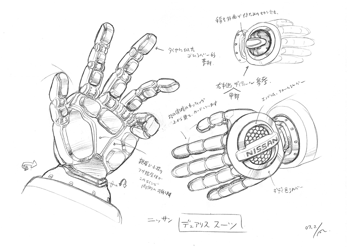 デザイン画 腕部手の甲にはニッサンのエンブレムを配置。これは両手を組んだとき、下腕に配置されたヘッドライトとの組み合わせで、デュアリスのフロント周りのイメージを再現するため。詳細はカラーページのアクションイメージを参照。